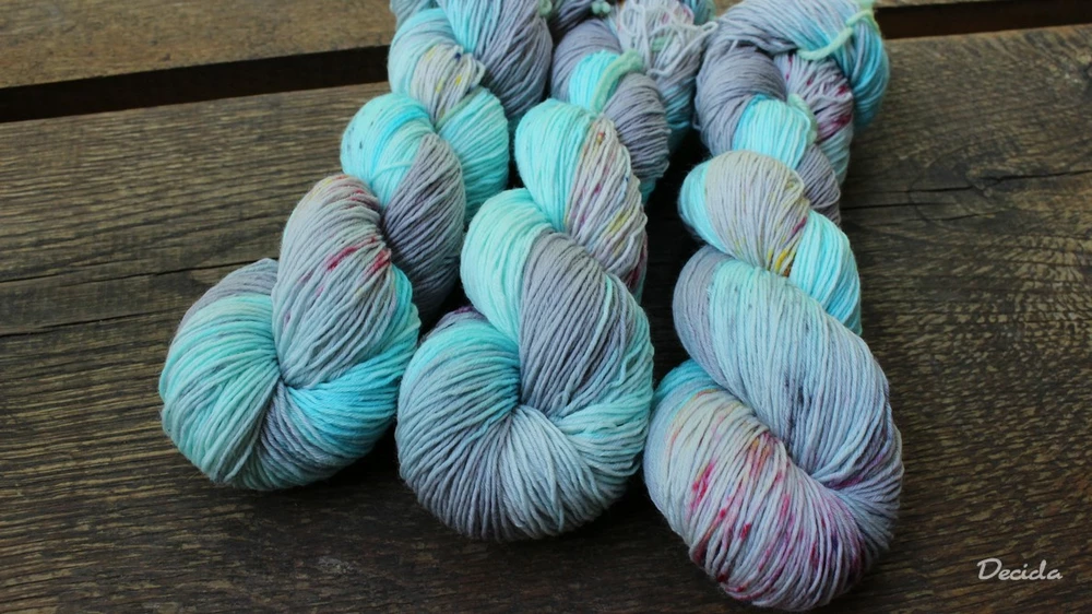 1/2 melírku odstíny azurové, 1/2 melírku odstíny šedé - doplněné krátkými barevnými úseky, vytváří v úpletu zajímavý efekt ♥