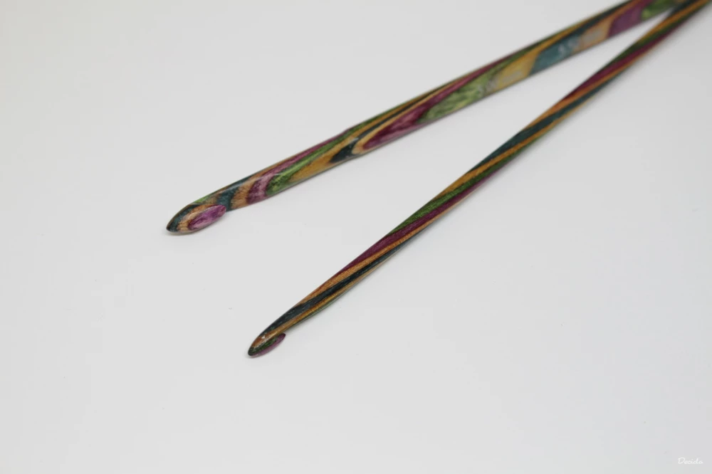 háček je vyrobený z tvrdého a barveného dřeva s unikátním chevron efektem, opatřeny vrstvou odolného laku a pečlivě vyleštěné. Materiál je velmi příjemný, na dotek teplý, vhodný pro jakoukoliv přízi.
