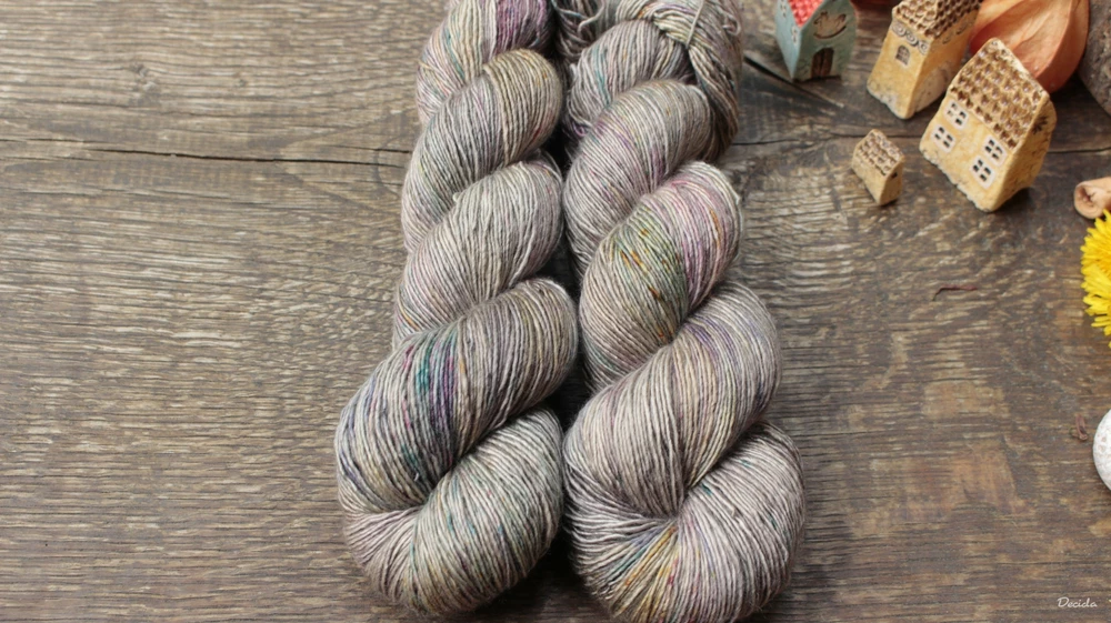 jemný odstín šedohnědé s decentními ťupkami v barvě růžové, tmavé tyrkysové, rezavé a fialové (bude z toho nádherný svetřík ♥)