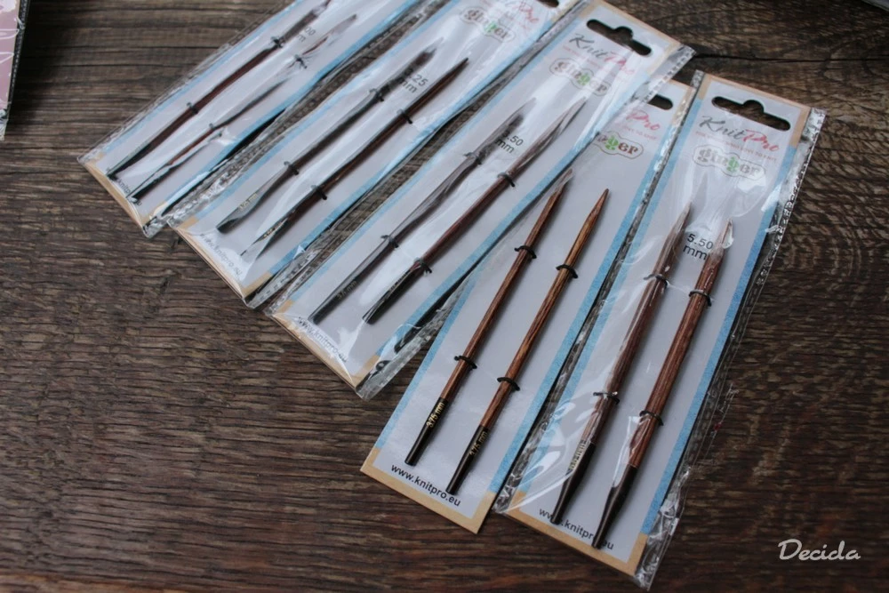 Šroubovací vyměnitelné jehlice řady Ginger jsou vyrobené z ekologicky zpracovaného dřeva s FSC certifikátem. Popisek velikosti jehlic je na kovovém uchycení, vydrží na jehlicích déle.
