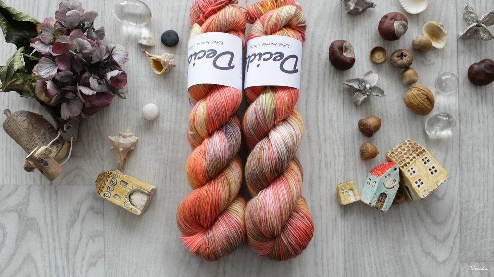 každé přadénko může být trochu jinak probarvené, pro rozměrnější úplety doporučuji střídat/pruhovat dvě přadénka po řadách