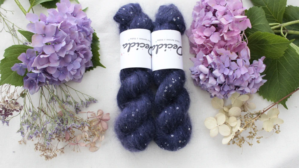 - "Fialová půlnoc" - 34% superkid mohér 11% hedvábí 41% nylon 14% polyester 195m/50g