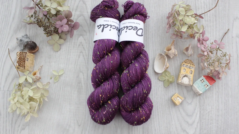 85% merino superwash a 15% barevné nopky Donegal (polyamid)