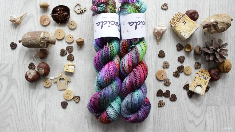 speciální ponožková příze s černou nitkou v nepravidelných úsecích, hodí se nejen na ponožky, ale díky své krásné jemnosti i na šátky, svetry a vlastně cokoliv, co Vás napadne...