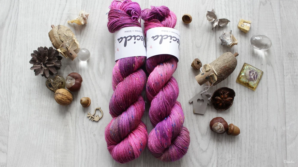 85% merino superwash a 15% Donegal barevné nopky (polyamid)
