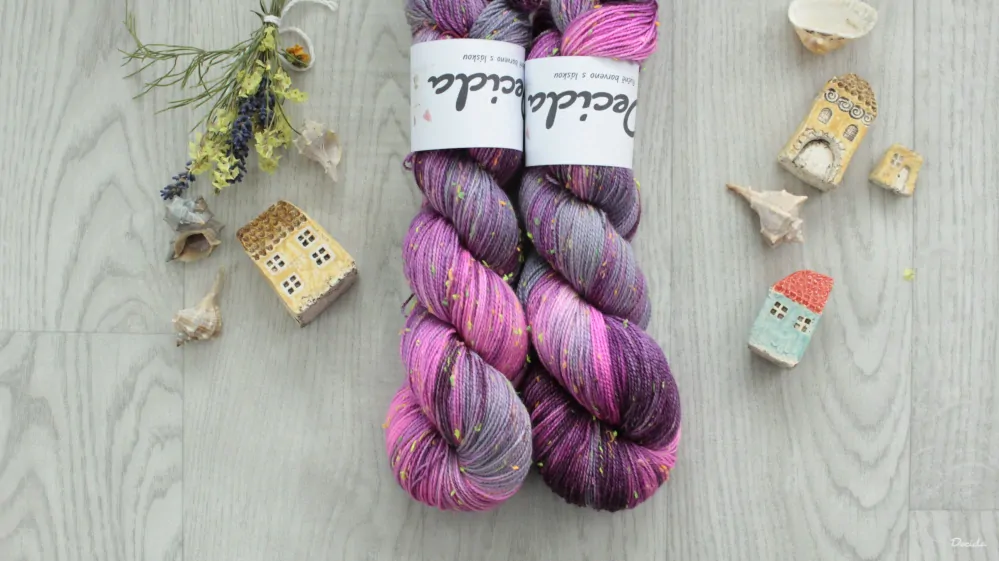 85% merino superwash a 15% barevné nopky Donegal (polyamid)