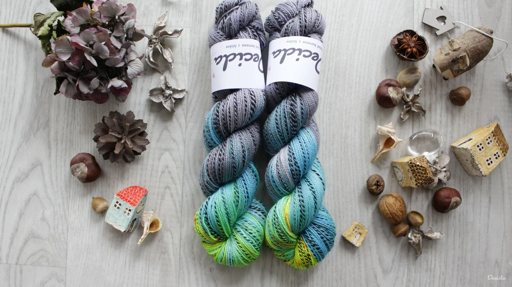 speciální ponožková příze s černou nitkou v nepravidelných úsecích, hodí se nejen na ponožky, ale díky své krásné jemnosti i na šátky, svetry a vlastně cokoliv, co Vás napadne...