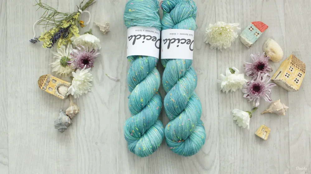 85% merino superwash a 15% barevné nopky Donegal (polyamid)