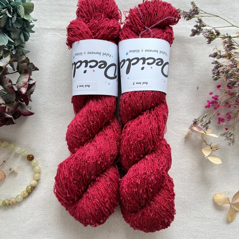 - "Red love 2" 42% hedvábí 26% baby alpaka 26% merino superwash a 6% zlatá stellina 980m