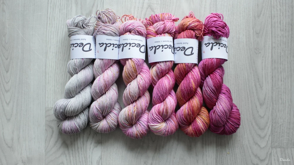 Speciální fade set s postupným barevným přechodem, barveným opravdu srdcem (pro pozvolný přechod doporučuji při změně na druhou barvu střídat dvě klubka a pruhovat)