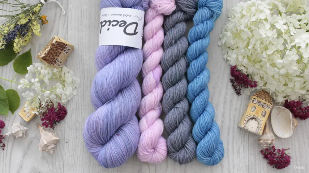 Set obsahuje 1x 100g přadeno a 3x 20g mini přadena, vše ve stejné přízi - ponožkové merino fingering75% jemné merino sw/ 25% polyamid, 100g = cca 365m