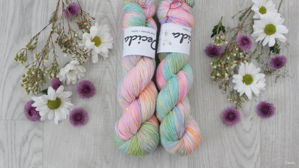 85% merino superwash a 15% barevné nopky Donegal (polyamid)