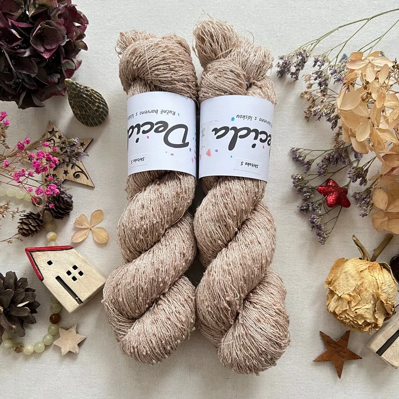 - "Shitake 5" 42% hedvábí 26% baby alpaka 26% merino superwash a 6% zlatá stellina 980m
