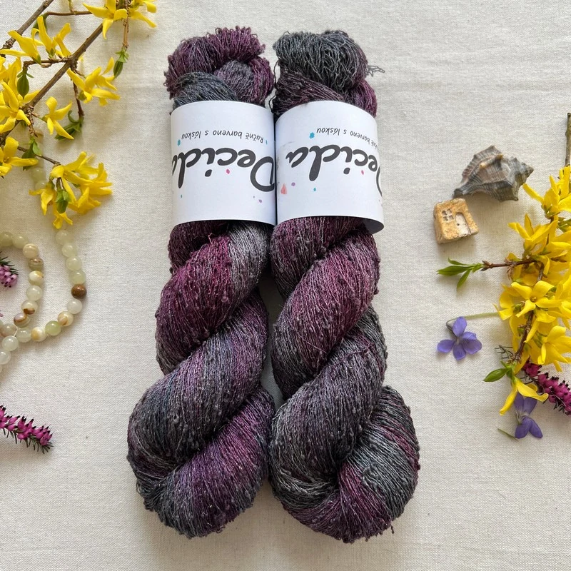 - "Smoked Plum" 42% hedvábí 26% baby alpaka 26% merino superwash a 6% zlatá stellina 980m