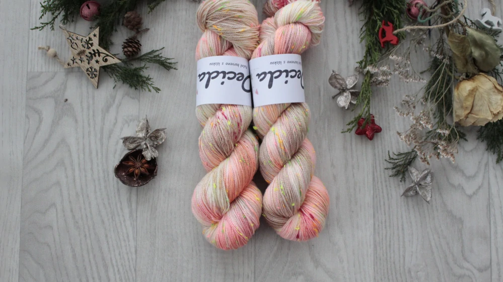 85% merino superwash a 15% barevné nopky Donegal (polyamid)