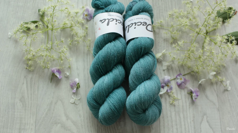 - "Teal" 75% merino 20% hedvábí 5% stříbrná stellina 800m