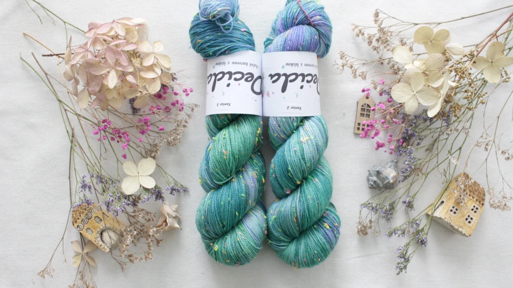 85% merino superwash a 15% barevné nopky Donegal (polyamid)