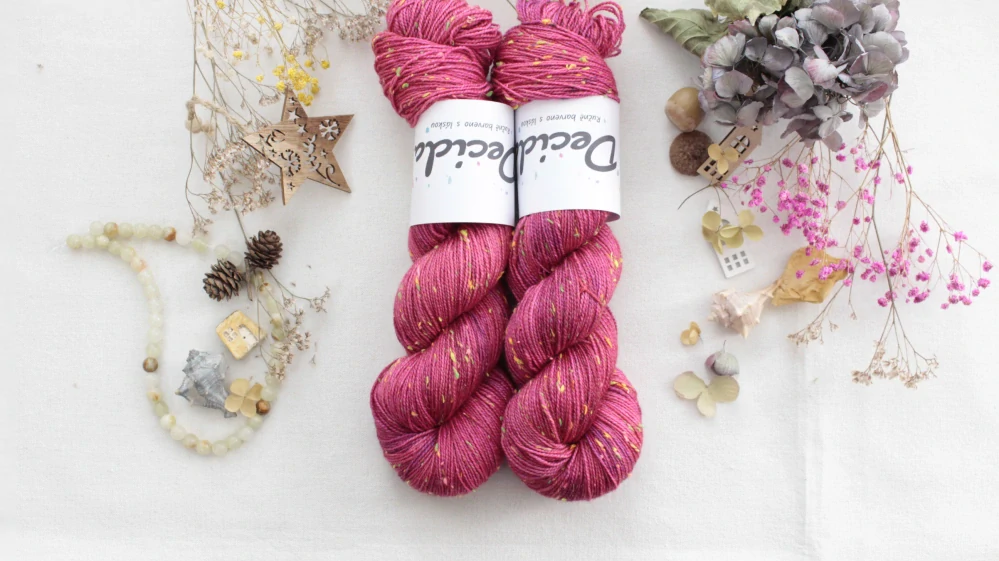 85% merino superwash a 15% barevné nopky Donegal (polyamid)